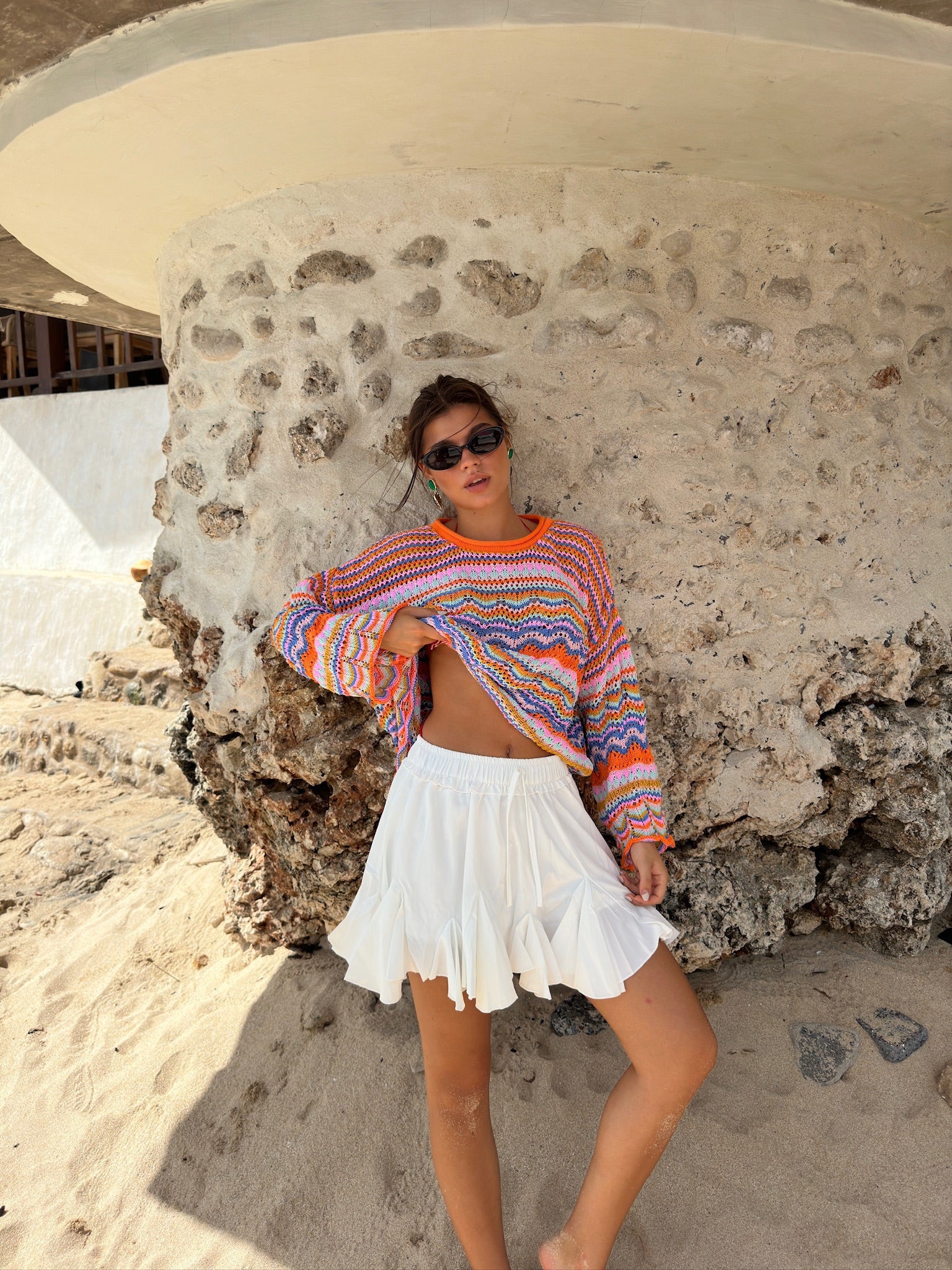 An exclusive crochet knit favourite in a vibrant mango hue, this relaxed-fit jumper is designed for comfort and layering-size up for an oversized look. Crafted from 100% cotton for softness and breathability.